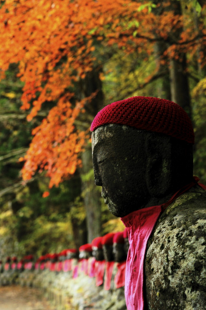 私と写真の師匠、そしてそのグル-プと日光に行って来ました。大変な混みようで!!紅葉の季節ですから当たり前と言えばその通りですが。比較的若者が多いのには驚きました。やはり日光です。さて、皆さんのご存知ない穴場を今日はご紹介いたします。日光と言えば東照宮、それにいろは坂の終点、明知平からのロ-プウエイ、そこから中禅寺湖からの奥日光、湯ノ湖となりますが、今回は、東照宮の前の狭い道を川に沿って走ります。その終点にお地蔵さんが並ぶハイキングコ-スがあります。数台の車が駐車している位でのんびり渓谷、紅葉が楽しめますよ。ゆっくりされたい方にはここはお勧めです。