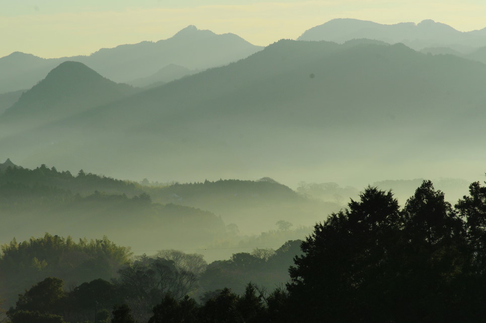 写真は空気遠近法といいますか霞のかかった山並みが遠くに見えませんか?南総里見八犬伝で有名な千葉県の富山からの朝の風景です。高い山は残念ながらないのですがご覧の通り山並みは大変美しいのです。
