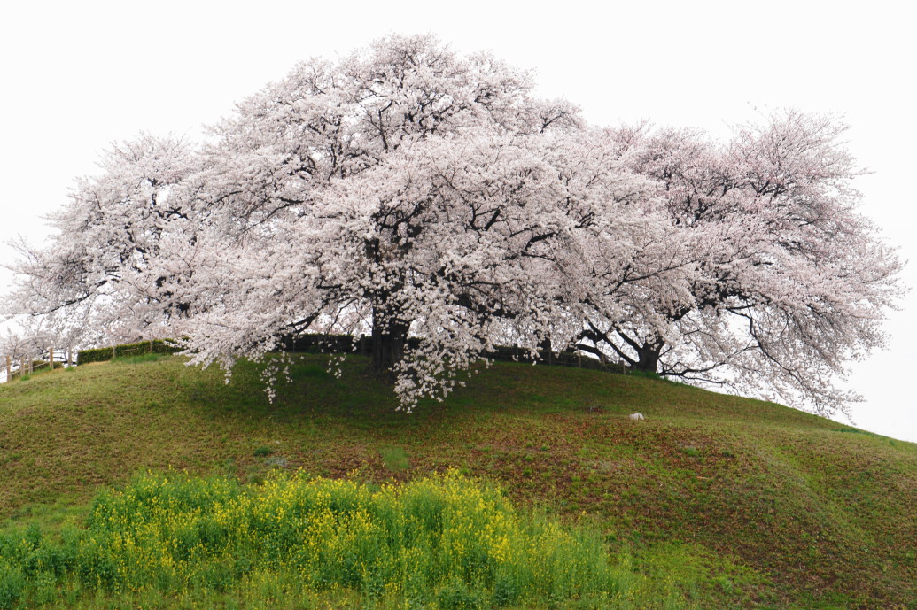 のぼうの城、2012年、野村萬斎主演の実話映画らしいですね。この映画のラストに桜咲く丘が出てきます。果たしてそこは?撮りたいとの一心でこの時期を待ちました。昨年もそうであった様にこの時期は群馬県安中市の磯部ガ-デンと言う所で合同研修があります。昨年かあら当社の新卒もこの研修に参加していますので応援の意味もあって現地に向かいました。実はこの桜は、モデルとなったのぼうの城から僅かの距離にある行田市のさきたま古墳公園内の桜でした。朝4時半に自宅を出て事前調査もあり迷うことなく目的地に着きました。小雨交じりの天気でしたが、丘の上の桜が目に入りました。(実は丘には変わりないのですが古墳の上に咲く桜です)感激ひとしお。予想通り素晴らしい桜でした。周囲にも桜咲き美しいの一言に尽きます。フィルムで勝負と考え1・5時間ほど撮影(デジタルでは数枚、内の一枚がこの写真)をしてから本来の目的地である磯部ガ-デンに向いました。新人4人、一生懸命研修に励んでいましたことを報告しておきます。私を見て(@_@;)していましたが。「鉄は熱いうちに打て」研修が終わっても打ち続ける必要がありますね。