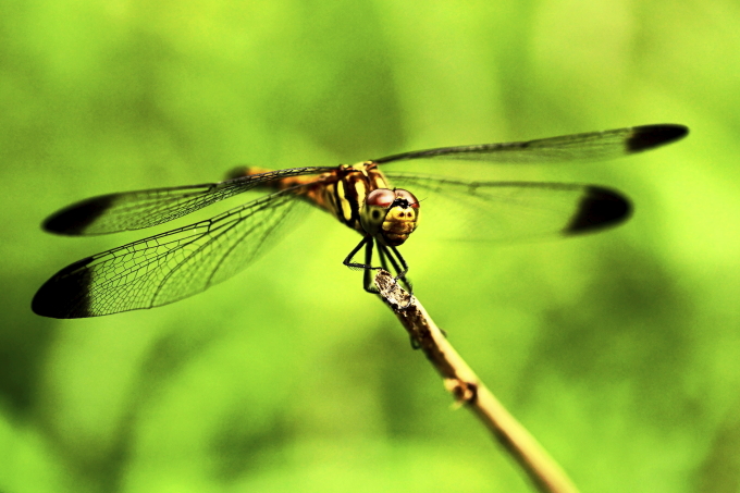 皆さんは仮面ライだ―をご存知ですよね。自分は初代ライダ―のインパクトが残っています。あの顔はやはり昆虫がモデルですよ。トンボが飛び回る夏。でも今年の夏は少し変ですが、トンボは飛んでいます。マクロレンズをカメラに装着、細い枯れ木に留まり羽を休めるトンボ、その顔は正に仮面ライだ―でした。写真見て下さい。