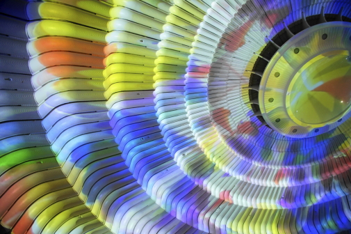 ここは入り口からエレべ-タ-で60mほど上がると、その頂上付近には宇宙を想像させる場所があります。天井に万華鏡の世界が投影されているのです。天空の感動美術館でした。