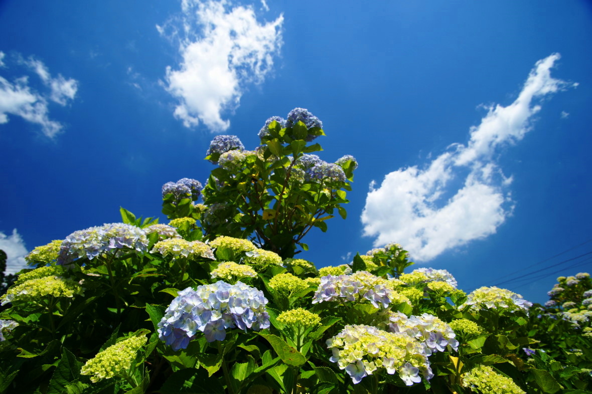 夏空は良いですね。先週は土日とも雨で散々でしたがこの土日は最高でした。自分は夏男ですからこれ位の温度と湿気が大好きです。たぶん35℃位までは体調は万全ですよきっと。昨日と今日、紫陽花の撮影に動いていました。遠方に行く必要がないのが一番。風景を撮る訳ではないのでどこでも被写体です。印旛沼近くの紫陽花ロ-ドと白井市の田園の紫陽花を鑑賞。今が旬ですかね。夏空との相性も最高。本来は梅雨空が合うのでしょうけど。