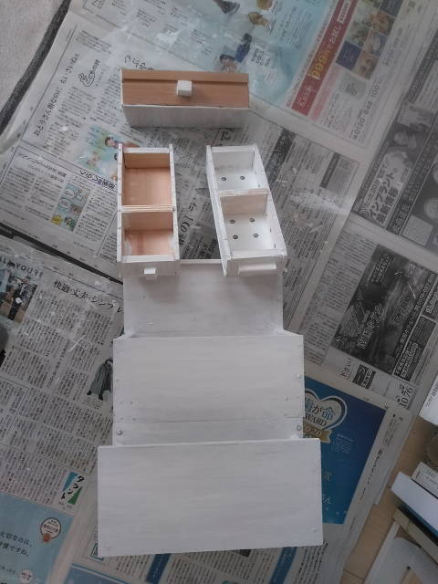 午前中は2週間前から廃材を利用して、設計図もなく思いのまま、切り貼りした、三段の小物置き、と小物入れに白くペイントしていました。
