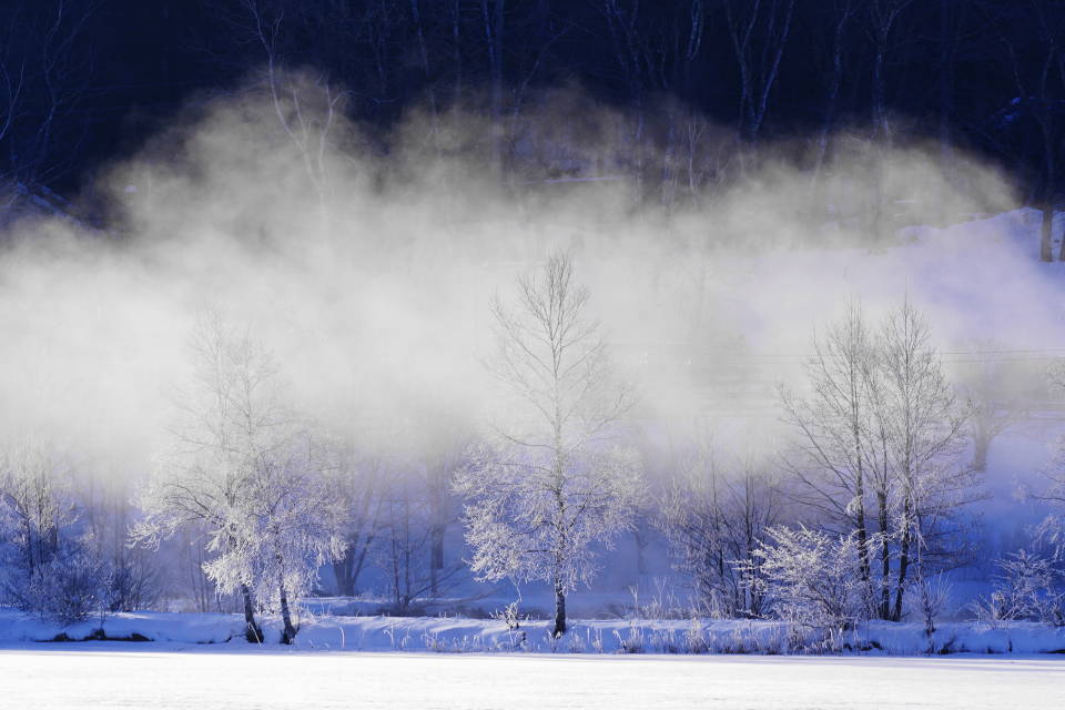 朝霧が凍りながら一定のリズムをもっては現れては消え、また現れる。白樺湖の朝の風景です。