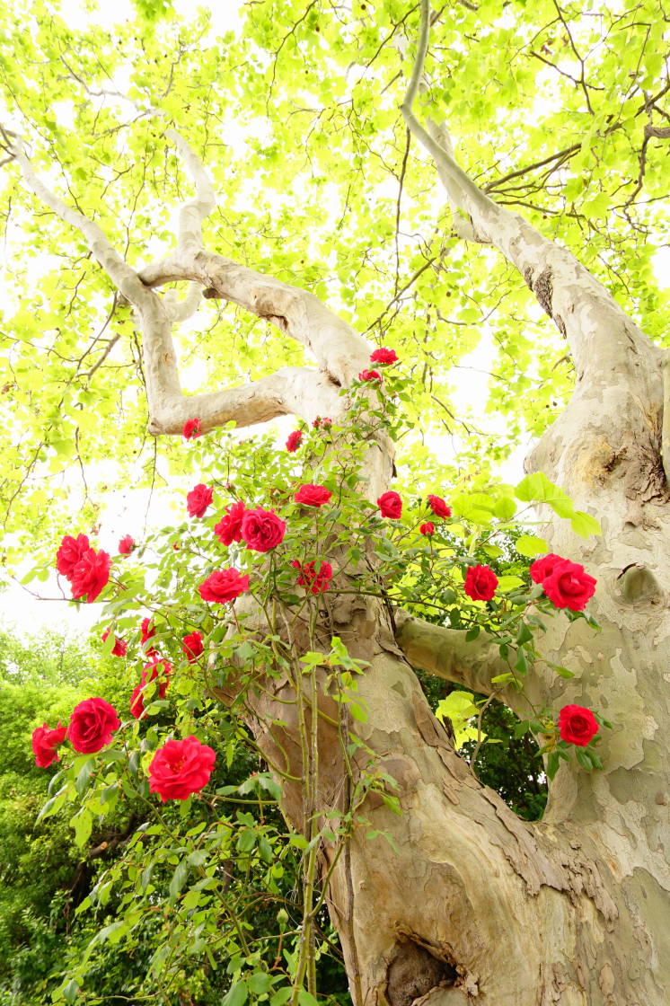 薔薇という花は不思議な花ですよね。季節問わず咲くのがまず不思議。今年は例年に比べて早咲きで且つ春が比較的高温であったたか花びらも大きく育ったとのこと。千葉県八千代市の京成バラ園の情報でした。この新緑光を受けた真っ赤なバラ・・・情熱の花はこの近くの木に寄り添って咲いていました。情熱の花に包まれた木が羨ましいですね。