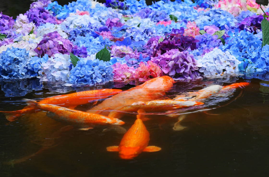 この写真は6月24日に撮影したものですが、鯉のオレンジ色もアジサイを引き立てていました。