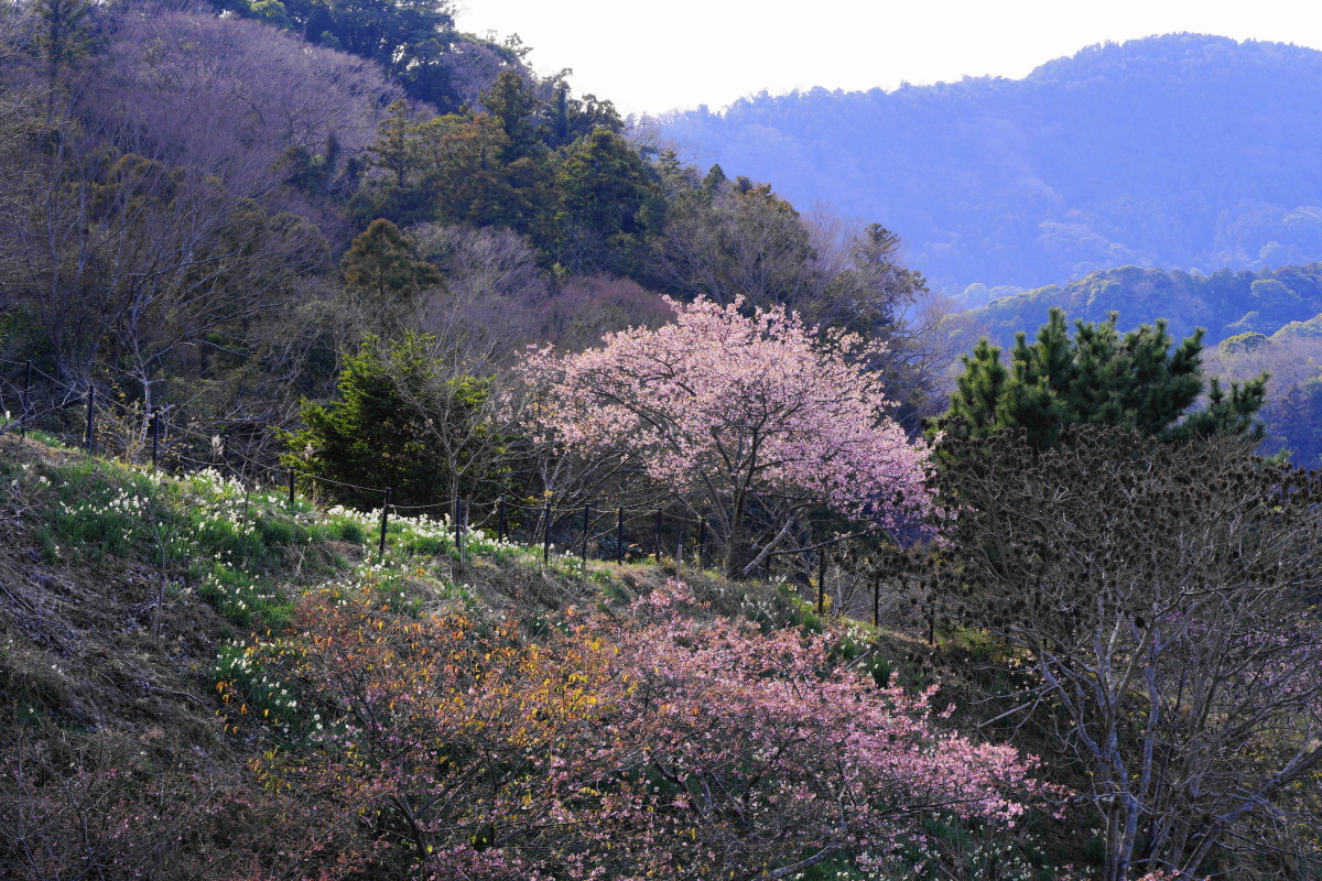 その水仙郷の中に河津桜(現地では頼朝桜と言われています、このルーツは平家討伐で戦った頼朝が、その戦に敗れ伊豆から当地に逃れて来たことからこの名が付きました)がまとまってまたは点々と咲いています。昨日1月31日は水仙が花盛り、頼朝桜は山の裾野では8分咲き、そこから100mほど高い山の頂上付近は3分咲き、桜には若干早かったようです。水仙の花は桜より長く咲いていますから、今年は来週の土日が見頃だと思います。トイレにはこの付近にまつわる話しが所々で紹介されていますので勉強にもなります。