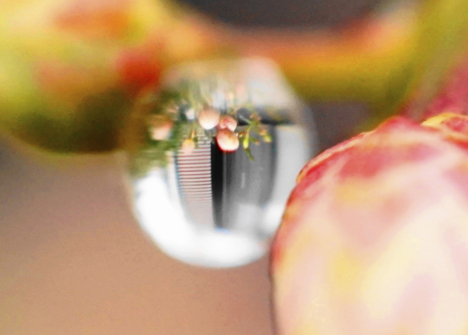霧雨の後、無風の時、写真の眼になるといたる所に水滴が光って見えます。雨ででかけない時は、雨上がりを狙い水滴をマクロレンズで撮影しています。これまで色々な水滴に出逢っていますが、蜘蛛の巣の背景にあるアジサイが映える水滴が自分の中では最高の水滴です。今回もこれを追って近くを散策したのですが、お気に入りの場面を見つけることが出来ませんでした。またどこかで探したいと思います。