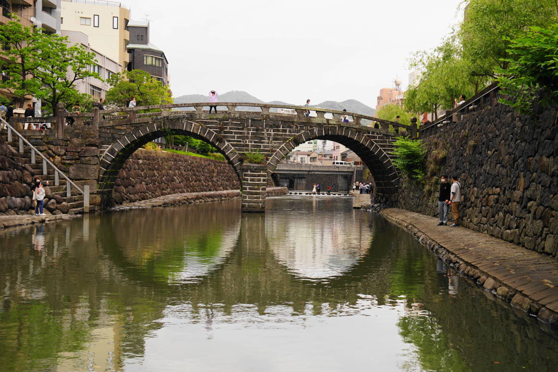 悲劇はこの眼鏡橋で起きました。眼鏡橋の正面から撮影できる観光用の飛び石でできた渡道が川に作られているのです。