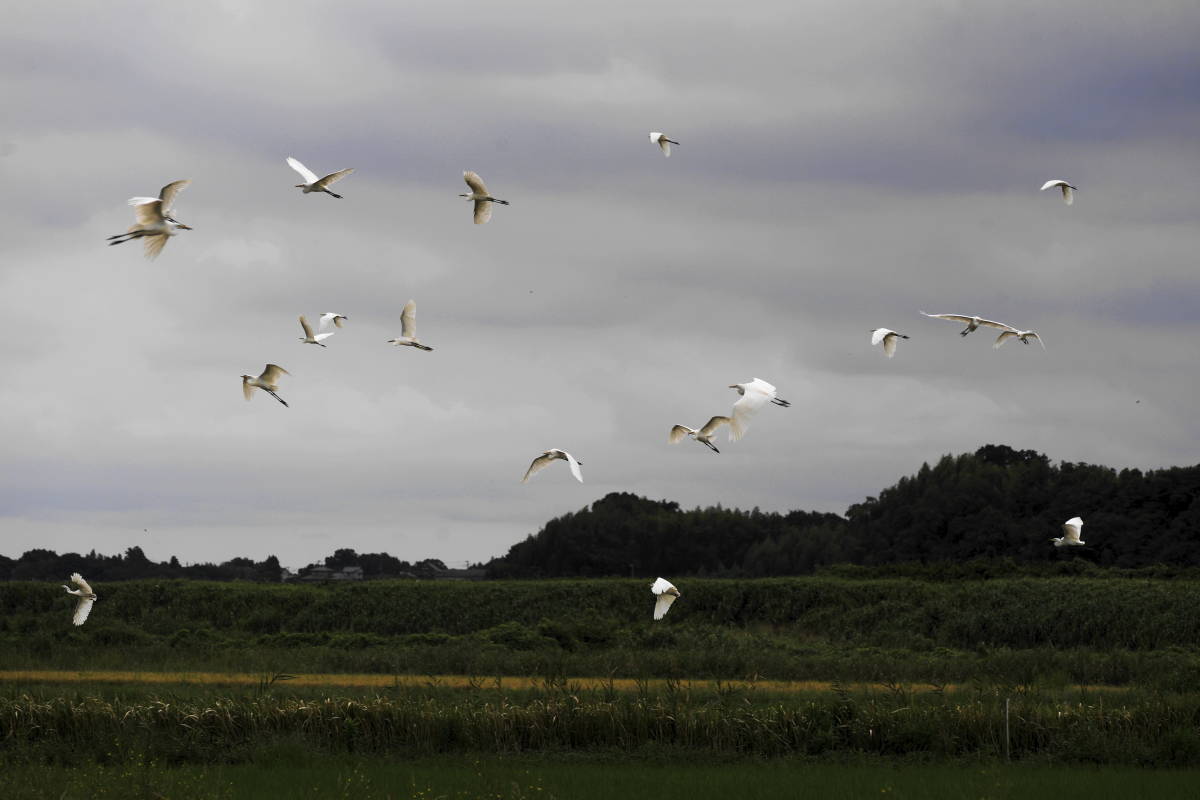 田んぼでは稲刈りのピークも過ぎてコンバインの周りにはシラサギが餌を求めて離れません