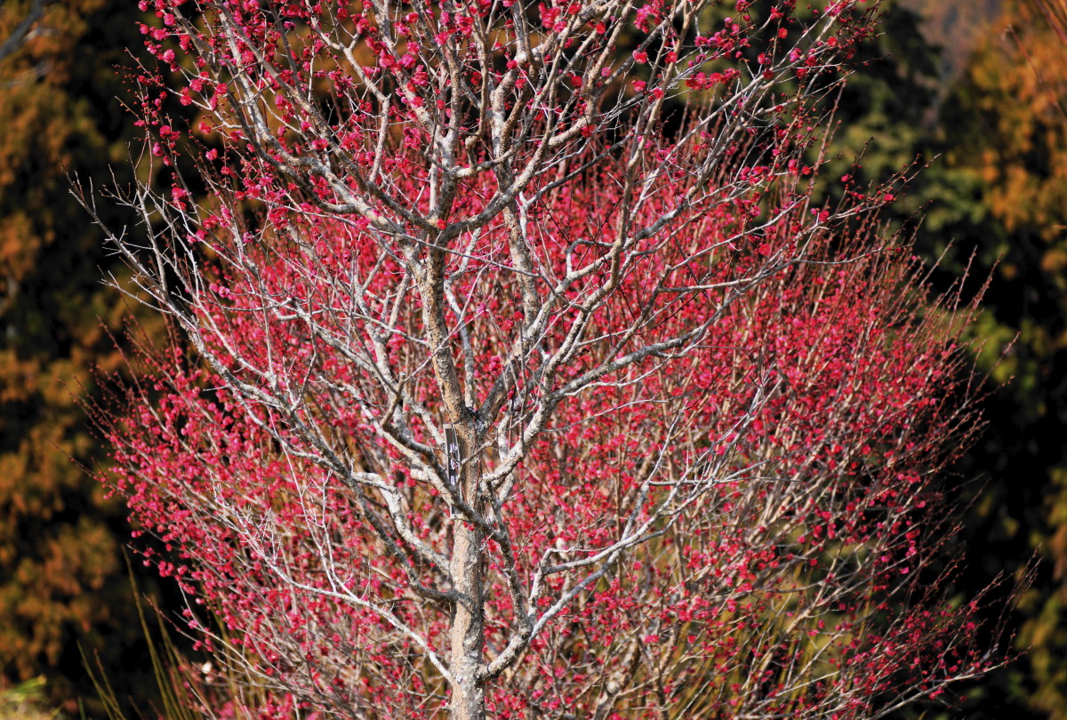 梅の木はまだ細く、あの力強い幹には出会えませんでしたが、それでも他の梅園に引けを取ることもなく、順調な復活が見て取れます。足元には黄色いフクジュソウも咲いて、10年前の梅園と変わったのは梅の木だけです。そんな中で力強い梅の木がありました。この写真です。